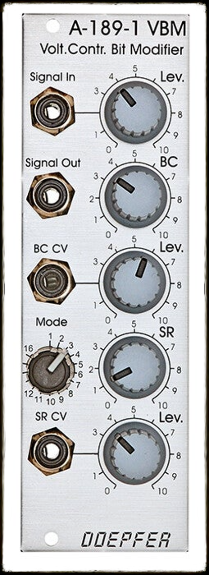 The signal input is equipped with an attenuator. As the module is DC coupled even control voltages can be processed. The mode (e.g. bit crunching, bit shifting, bit exchange) is selected by a 16-position rotary switch: