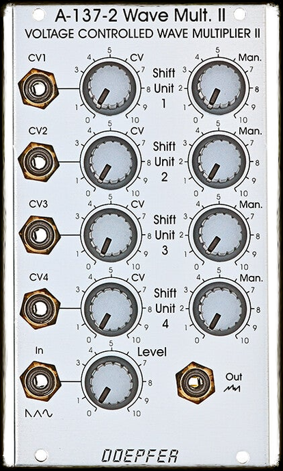 Module A-137-2 is another version of a wave multiplier. In contrast to the A-137-1 Wavemultiplier I the A-137-2 generates four phase-shifted copies of a VCO signal applied to the audio input. The four shifted signals are added to the original signal to obtain a fat sound similar to five independent VCOs. The phase shifting is made by a simple circuit that works only for sloped signals like sawtooth, triangle or sine, but not for rectangles or pulses.