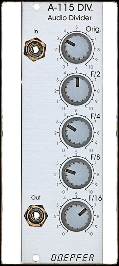 The frequency of a signal at the input is halved (half frequency = first sub-octave), quartered (1/4 frequency = second sub-octave), and so on. In this way, the DIVIDER produces four sub-octaves (F/2 down to F/16). At the output, the A-115 produces a summed mix of the original and the four sub-octaves. There are attenuators to control the amount (ie. Amplitude) of the original signal and each of the sub-octaves. Bear in mind that the sub-octaves output by the A-115 are all true square waves. At the output there are always four square waves and the original signal available.