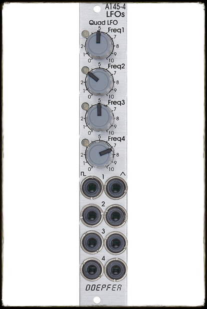 Module A-145-4 is a simple quad LFO (Low Frequency Oscillator). Not a very "exciting" module, just a bread-and-butter device and a simple demon for work. Virtually in every modular system several LFOs are required for modulation purposes. The module contains four simple LFOs with the waveforms triangle and rectangle. A dual color LED (red = positive / yellow = negative output voltage) indicates the triangle output of each LFO. The frequency range can be chosen for each LFO individually by means of a jumper between about 50 Hz ... 0,04 Hz (about 20 seconds, jumper removed) and about 2Hz ... 0,002 (about 8 minutes, jumper installed).