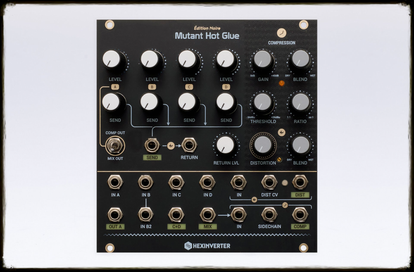 The Mutant Hot Glue is a versatile bus mixer for analog effects chain design. The included analog compressor offers series or parallel compression and a sidechain input, making it particularly well suited to drum processing. The voltage controlled distortion is based on ideas borrowed from the guitar pedals responsible for a lot of yesterday’s acid style techno sounds, but improved over the guitar equivalents, and made specifically for synthesizer and drum processing. The distortion can be used in its default position, normalized to the effects send, or like every other part of the module, broken out and used elsewhere in your modular system.