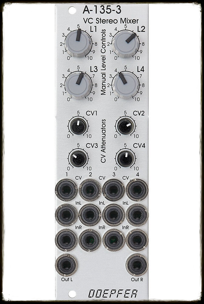 A-135-3 is a is a voltage controlled stereo mixer with four inputs. Behind a front panel with 8 HP only eight linear VCAs (voltage controlled amplifiers) and the mixer based on the VCAs are available.