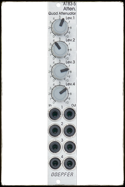 Module A-183-5 is a simple passive quad attenuator. Passive means in this context, that each unit is made of two sockets and a 50k linear potentiometer only. There are no active parts like amplifiers or buffers and no power supply is required.
