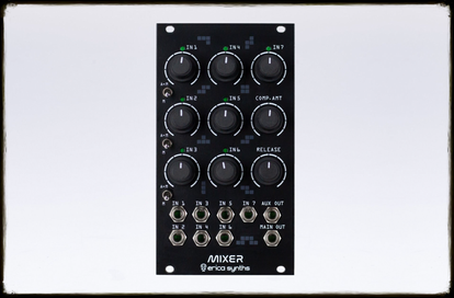 Erica Synths Drum Mixer with extended headroom and a dedicated drum compressor of unique design keeps each drum sound clearly distinguishable and adds power to the final mix. Bonus feature - effects send output allows to apply external effects to the signals on the first three inputs. LEDs next to each input give visual feedback on the signal level.