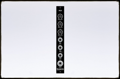 Pico Mixer is simple 3 channel DC coupled mixer intended to mix AUDIO SIGNALS AND CV SIGNALS in order to obtain complex modulations. Also it may serve as CV AND AUDIO attenuator.
