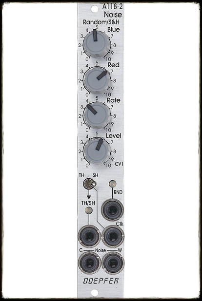 It produces three types of signal: white noise, colored noise, and random voltage. White and colored noise can be used as audio sources, and also, in conjunction with a sample and hold module, as control voltages, and the random voltage is a useful source of voltage control, especially for its low frequency content.