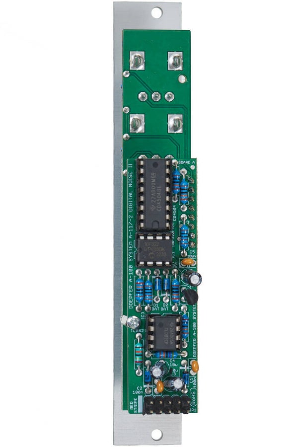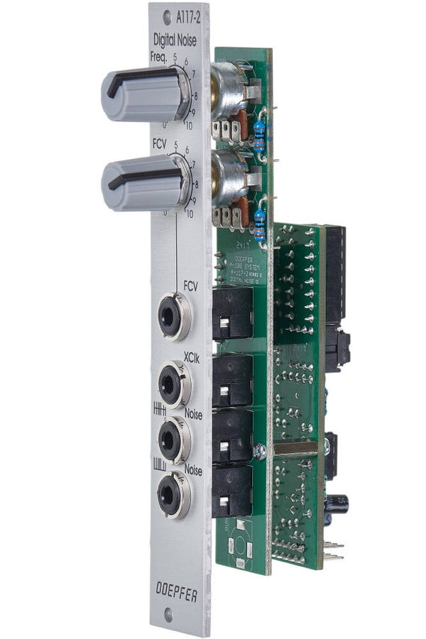 Module A-117-2 contains a digital voltage controlled noise generator. It produces random sequences of square pulses whose rate can go from random clicks to audible noise. The colour of digital noise is different from analog noise. The frequency of the internal clock oscillator can adjusted manually (control "Frequ.") and via an external control voltage input ("FCV") with associated attenuator. The internal clock range is about 50Hz to 40kHz. With control FCV fully clockwise the sensitivity of the control voltage input is roughly 1V/octave.
