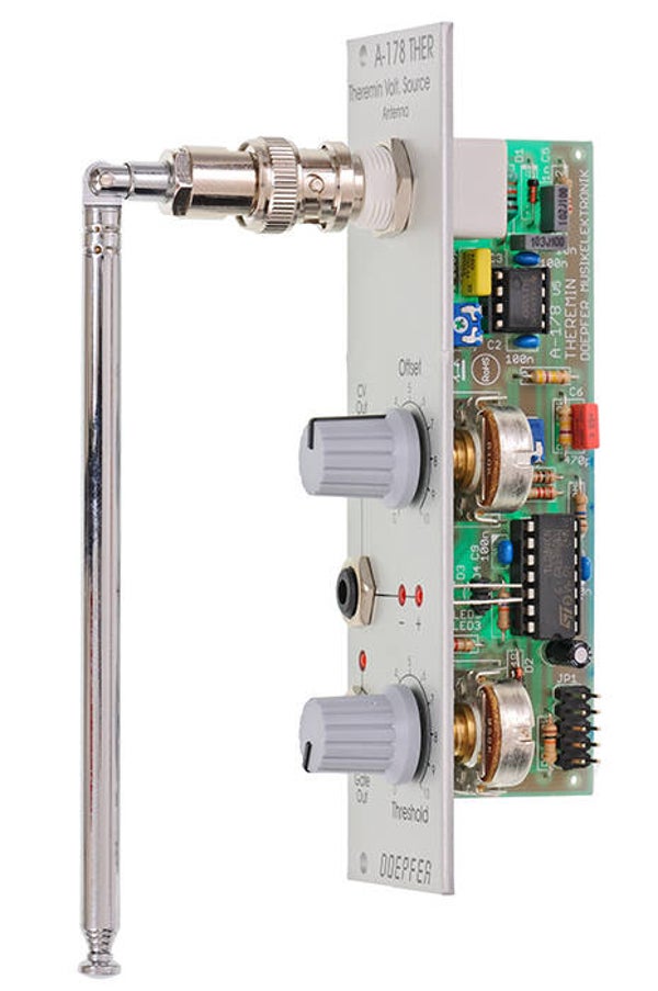 Theremin module for generating a variable control voltage by approaching/removing hand to/from an antenna.