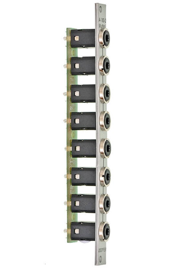 It has eight inter-connected sockets, so that you can patch more inputs or outputs into any module. The sockets are split into two groups of four. If an 8-fold multiple is required a bridge has to be soldered at the pc board. Even though the A-180-1 is a very "primitive" low-level module it is required very often. Within a big A-100 system sufficient multiples should be planned.