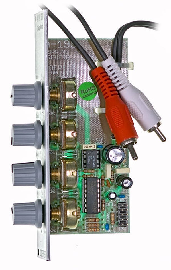 Module A-199 is a spring reverb module. The reverb effect is electronically simulated by means of 3 spiral springs.