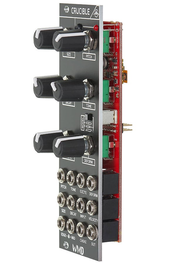 By using classic digital synthesis blocks such as delay and digital filters, Crucible can synthesise sounds in real time that resemble thinly struck pieces of metal.